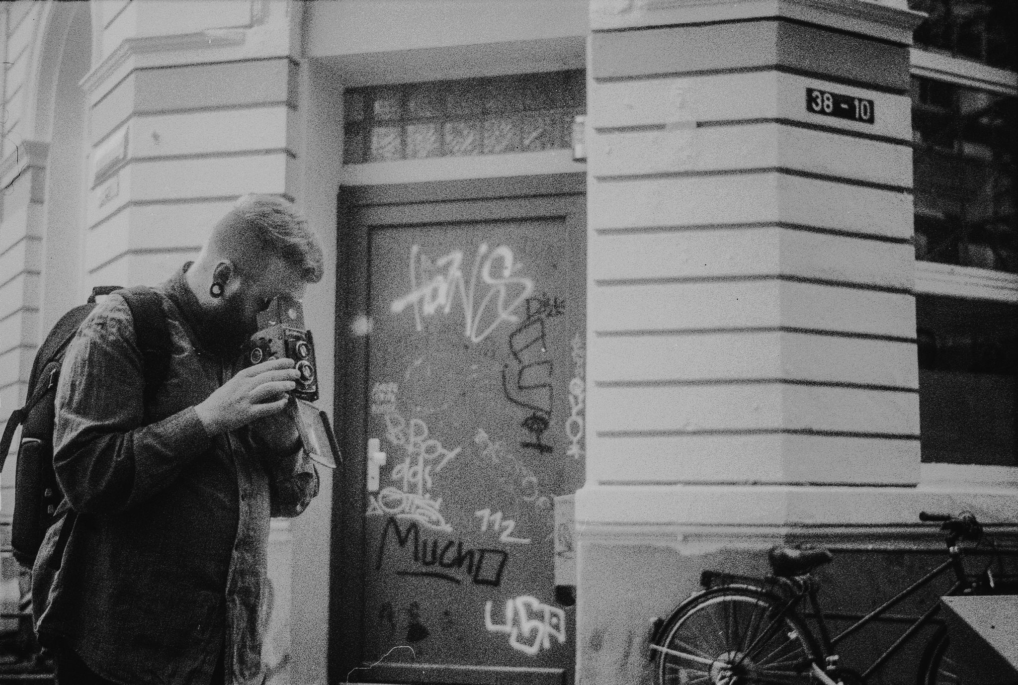 Eike Fischer: It's me on the old streets in Altona, Hamburg, Germany in 2022 with an old rolleicord II build in 1936.